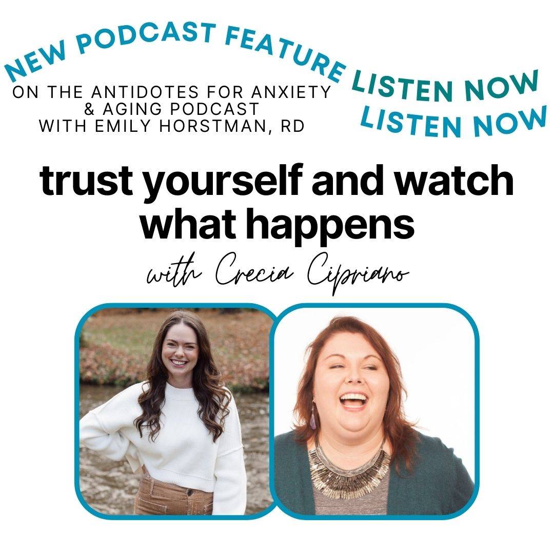 hey, pickle dip. last week i was featured on the antidotes for anxiety & aging podcast with emily horstman, RD, and iâm super excited to share it with you! you can give it a watch right here â go ahead + subscribe to her substack if you dig it! emily + i âmetâ on a one-off call for a writing program we both took, quickly took it to socials + then a 1:1 video chat before making it podcast official ;) sheâs a longevity specialist, dietitian, wellness chaser challenging the status quo, and such...